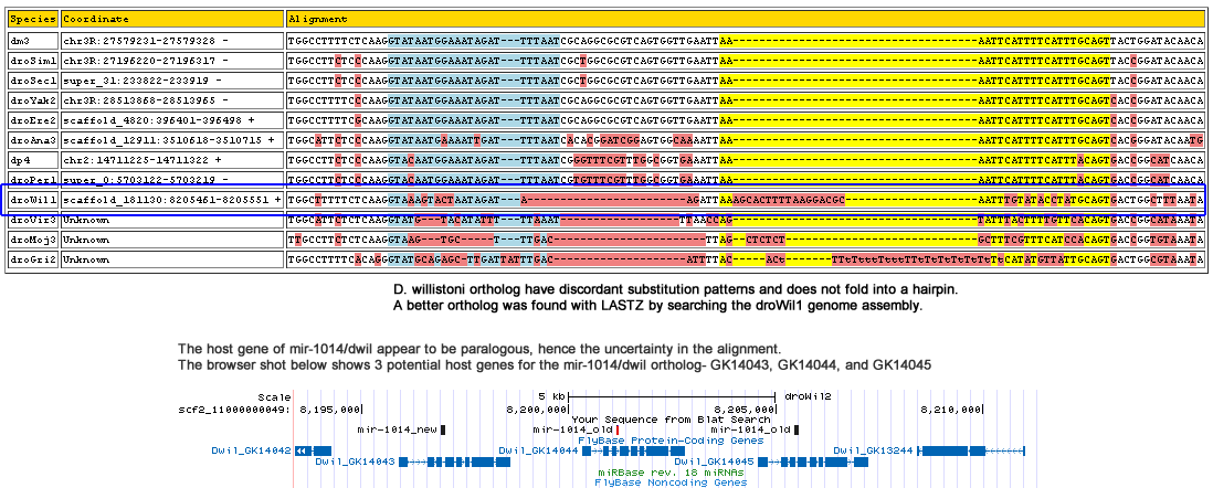| droWil1 | scaffold_181130:8196915-8197021 + | TGGCATTTTCTCAAGGTGAAATGAAAATAAATTTTAATTCGGATAGAAA----GC---------TAATCTAATTGT-A-----TTG--CATTAA------------AATTCGTTTTCATTTGCAGTATCTGGTCTAAATA |