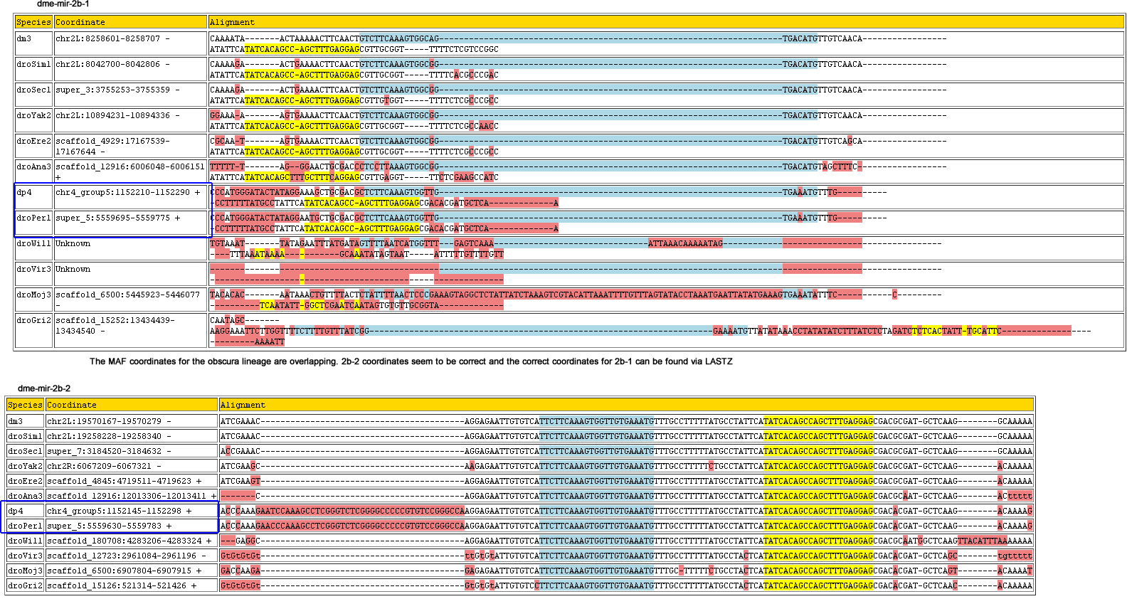 | dm3 | chr2L:8258601-8258707 - | CAAAATAACT-------AAAAACTTCAACTGTCTTCA-----------------------------------------AAGTGGCAGTGACATGTTGTC----------------------------AACAATATTCATATCACAGCC-A-GCTTTGAGGAGCGTTGCGGTTTTTCT---------CGTCCGGC----- |