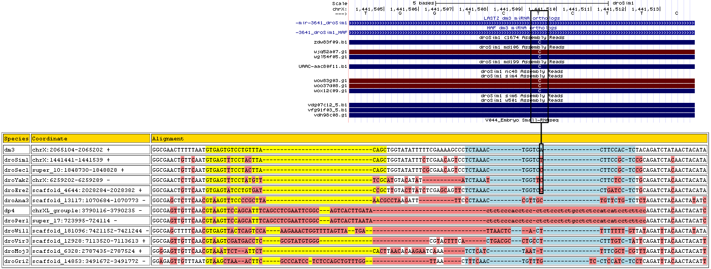| dm3 | chrX:2065104-2065202 + | GGCGAACTTTTTAATGTGAGTGTCCTGTTT------------ACAGCTGGTATATTTT---------TCGAAA---AGCC----------CTCTAAAC---------TGG------------T---CACTTCCAC-TCTACAGATCTATAACTACATA |