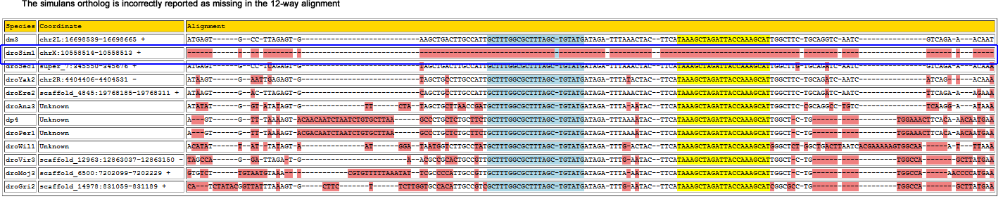The correct ortholog was only found in 4 of the 7 species. It was found partially in 1 (c1674) and not found in 2 (sim4 & md106).