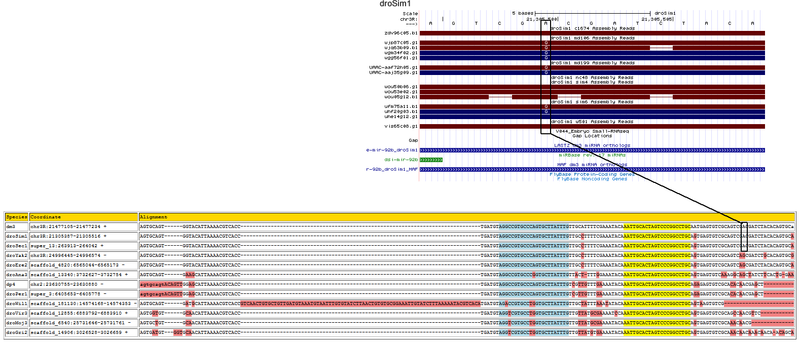 | dm3 | chr3R:21472213-21472337 + | TTTCAGCCGAA--------TATAAAT----------------------------------------------ATGAATTTCCCGTAGGACGGGAAGGTGTCAACGTTTTGCATTTCGAAT-AAACATTGCACTTGTCCCGGCCTATGGGCGGTTTGTAAT-----AAACA------------ACTAAAATCTA-------------T----AAA |