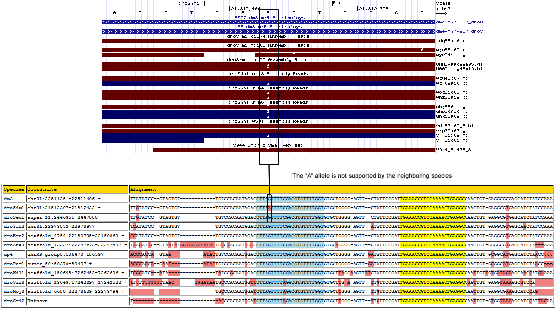 | dm3 | chr3L:22511281-22511406 - | TTATATCCG---TAGTGT------------TGTCCACAATAGACCTTAGTTTTCGACGTGTTTTGGTGTGCTGGGG-AGTT--CTATTCCGATTGAAACCGTCCAAAACTGAGGCCAACTGT-GAGGCGCGAGCATCTA----TCCAAA |