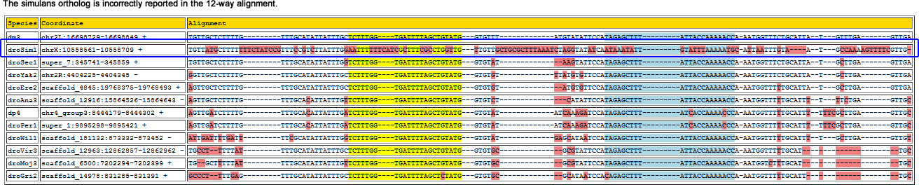 | dm3 | chr2L:16698729-16698849 + | TGTTGCTCTT------------T-TGTTTGCATATTATTTGCTCTTTGGTGATTTTAGCTGTATGGTGTTTATGTATATTCCATAGAGCTTTATTACCAAAAACCAAATGGTTTCTGCATTAT---GTTTGAGTTGA |